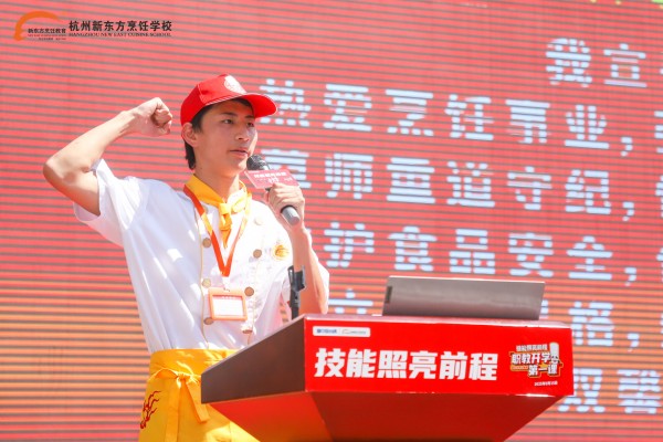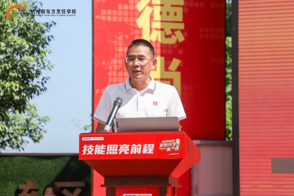 活動最后,校長上臺致辭。他首先向滿懷夢想、朝氣蓬勃的新同學(xué)們表示最熱烈的歡迎,歡迎大家加入杭州新東方這個傳承技藝、創(chuàng)造美味的大家庭,同時也向如期返校的同學(xué)們致以誠摯問候。